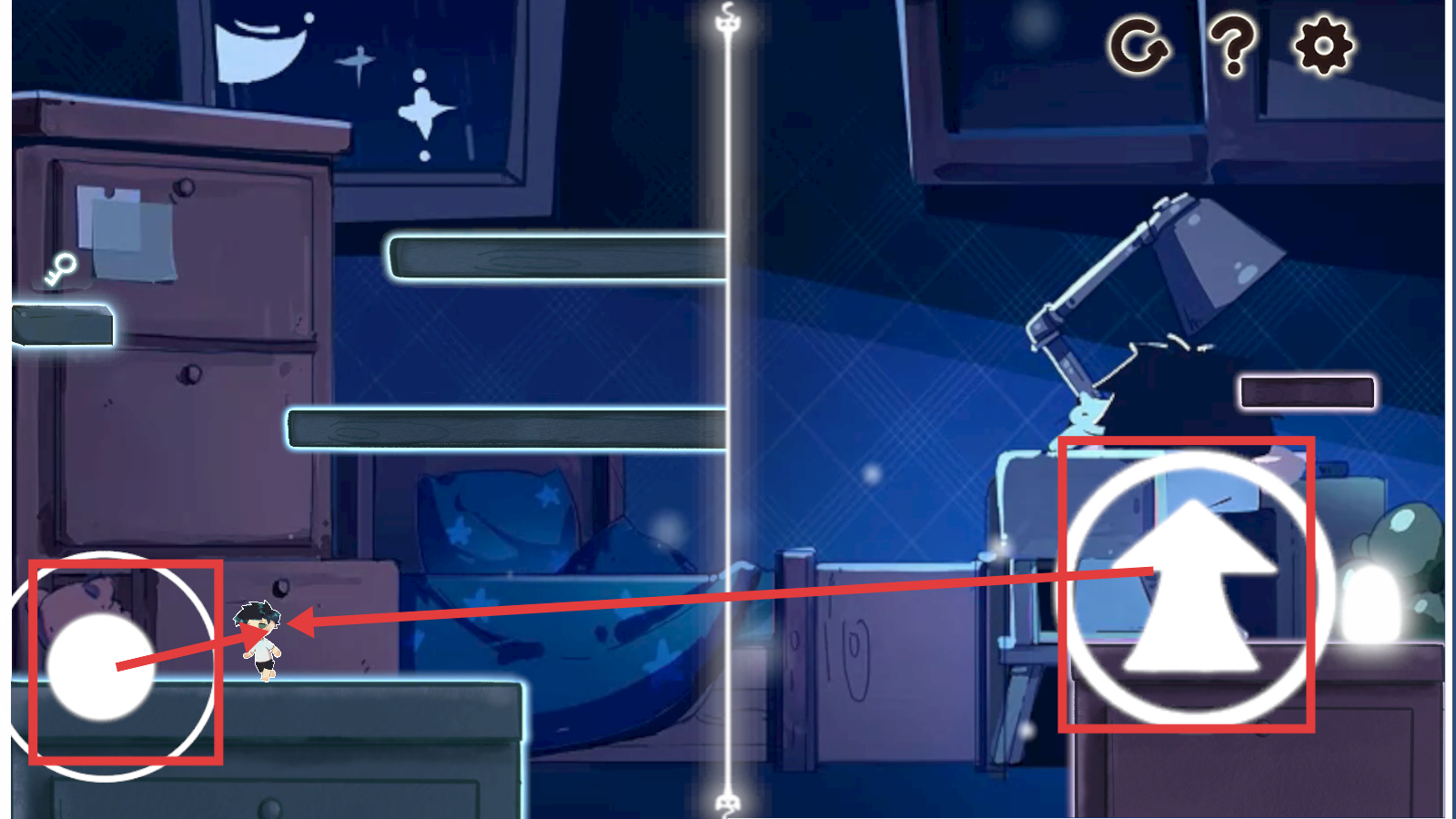 1、操控角色,利用左侧和右侧的操作区域移动,在房间场景中探索,开启冒险进程。