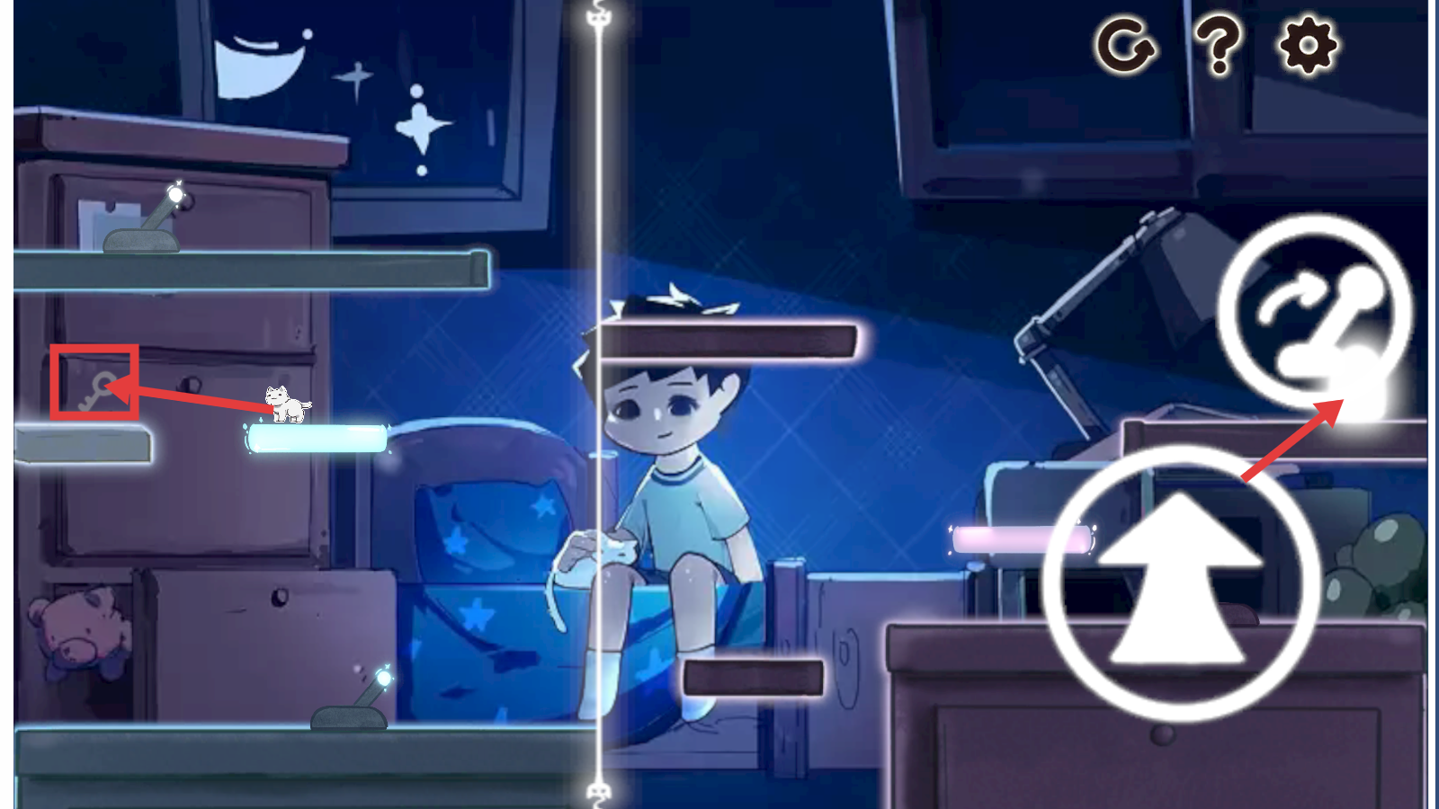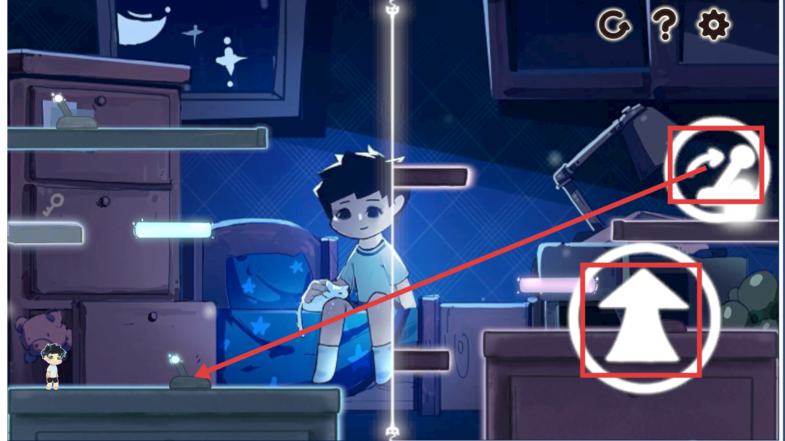1、操控角色,利用右侧【跳跃】【移动】操作键,触发左侧机关,在房间场景中推进关卡进程。