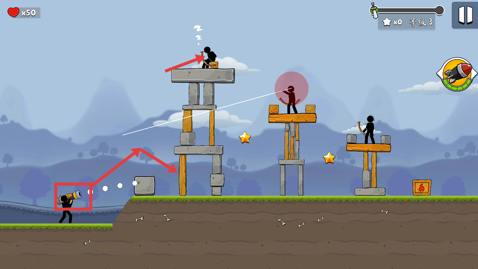 4、操作逻辑直观易懂,通过拉动火柴人即可锁定发射路线,松开瞬间完成射击,无需复杂操作记忆,新手也能快速上手。