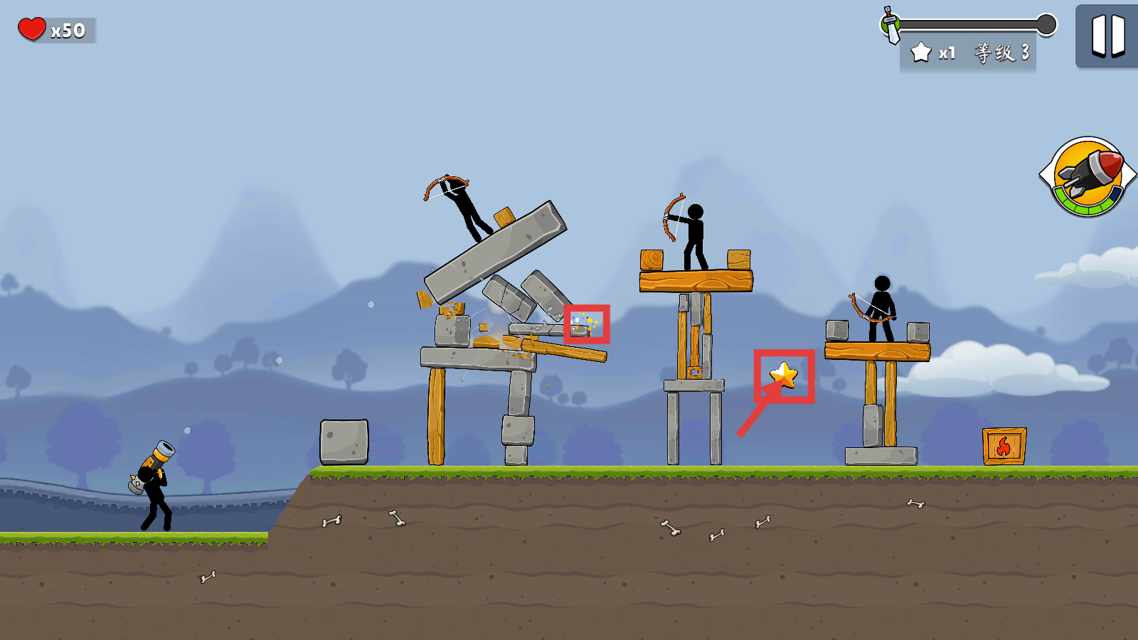 3、攻击后收集【星星】,提升关卡评分,为获取更高奖励创造条件。