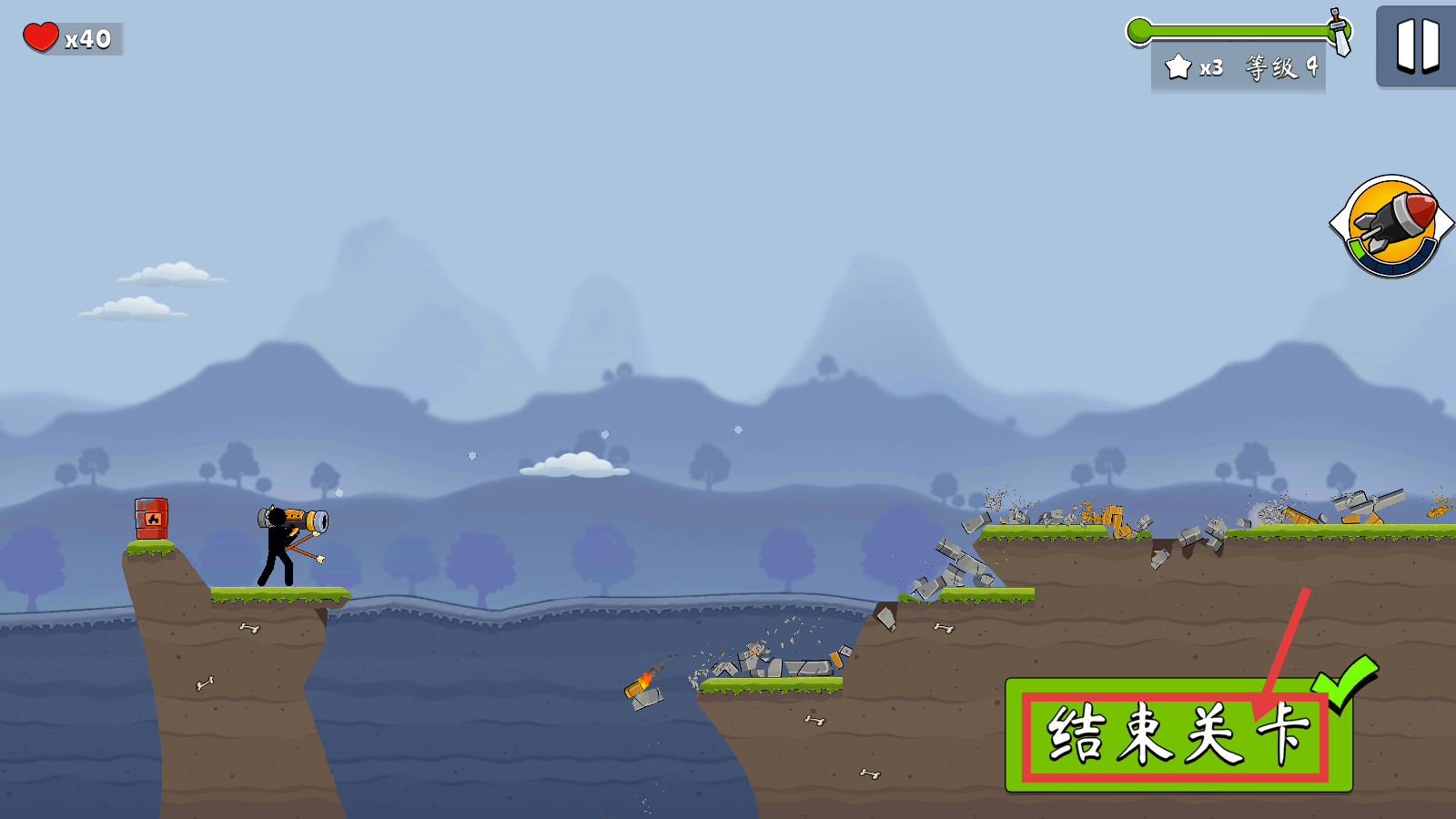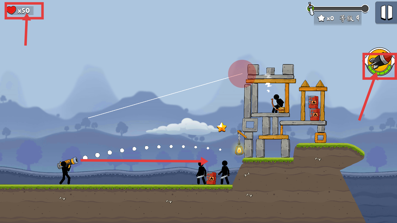 2、进入关卡后,关注【心x50】生命值,利用右侧火箭武器,瞄准敌方建筑发起攻击,推进战斗。