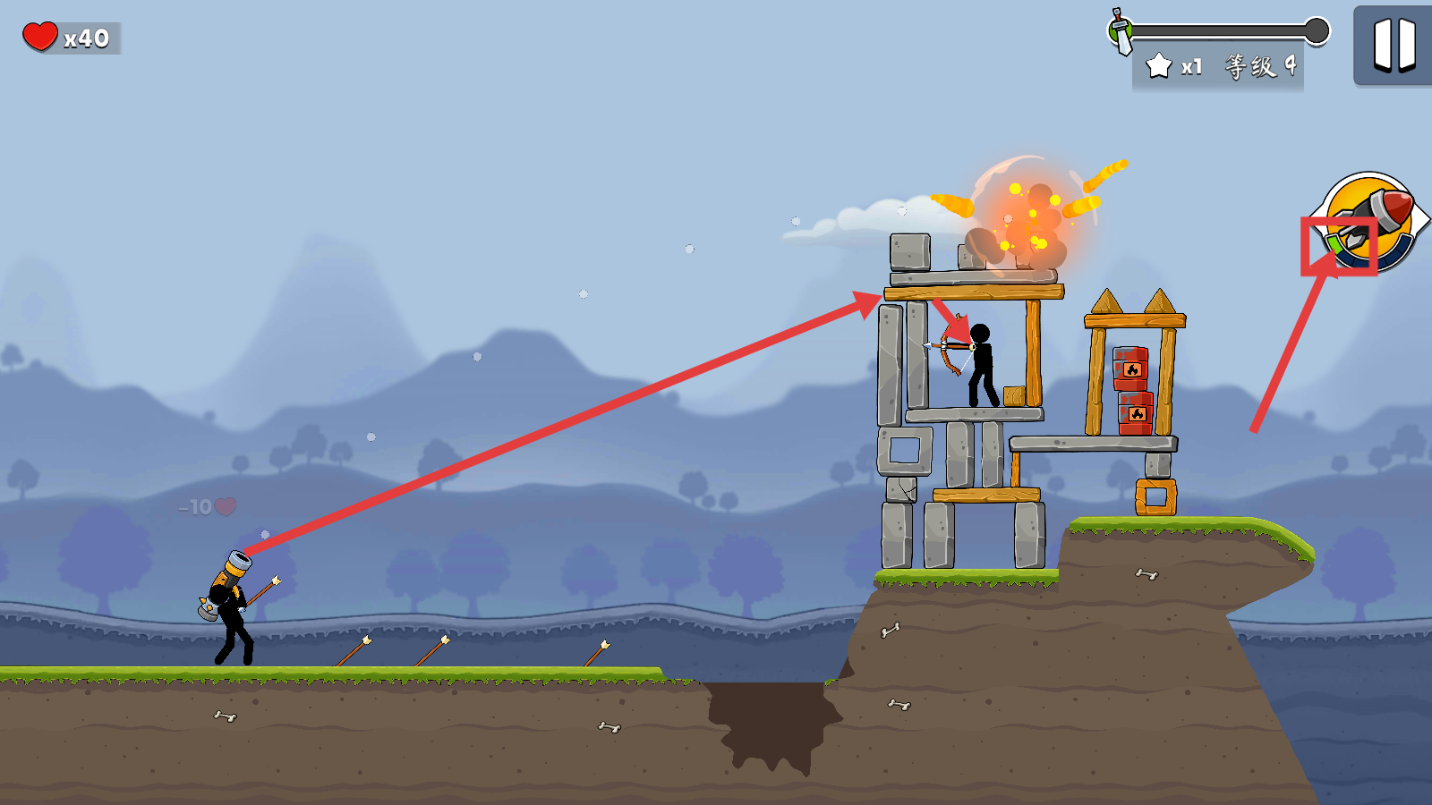 3、战斗中使用火箭武器攻击敌方弓箭手,注意生命值变化,收集星星提升关卡评分。