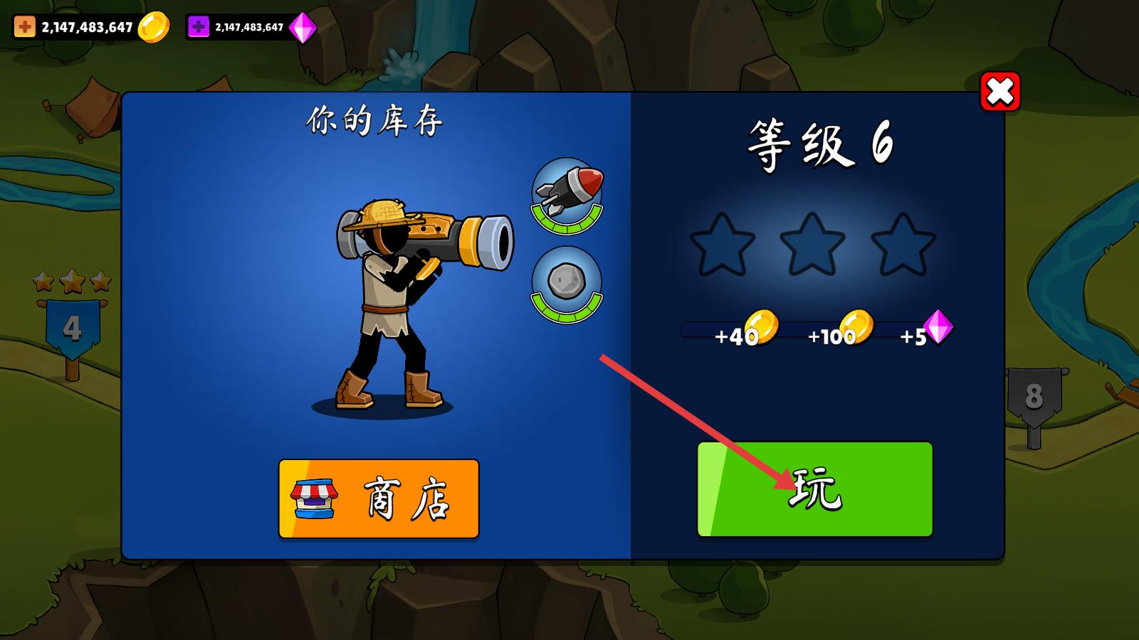 1、选择【等级6】关卡,点击【玩】进入,可获取【+40-金币】【+100-金币】【+5-钻石】奖励,开启挑战。