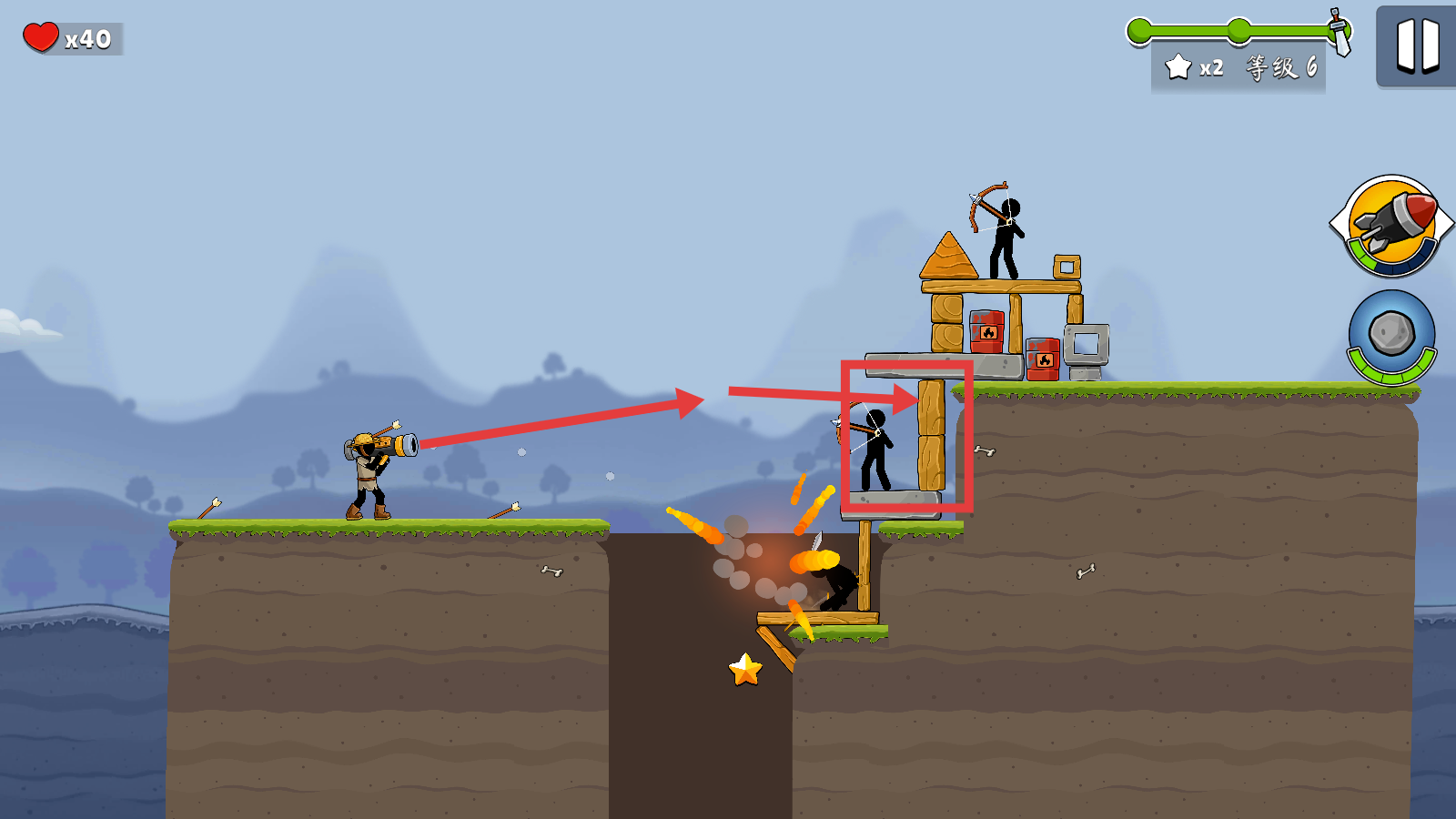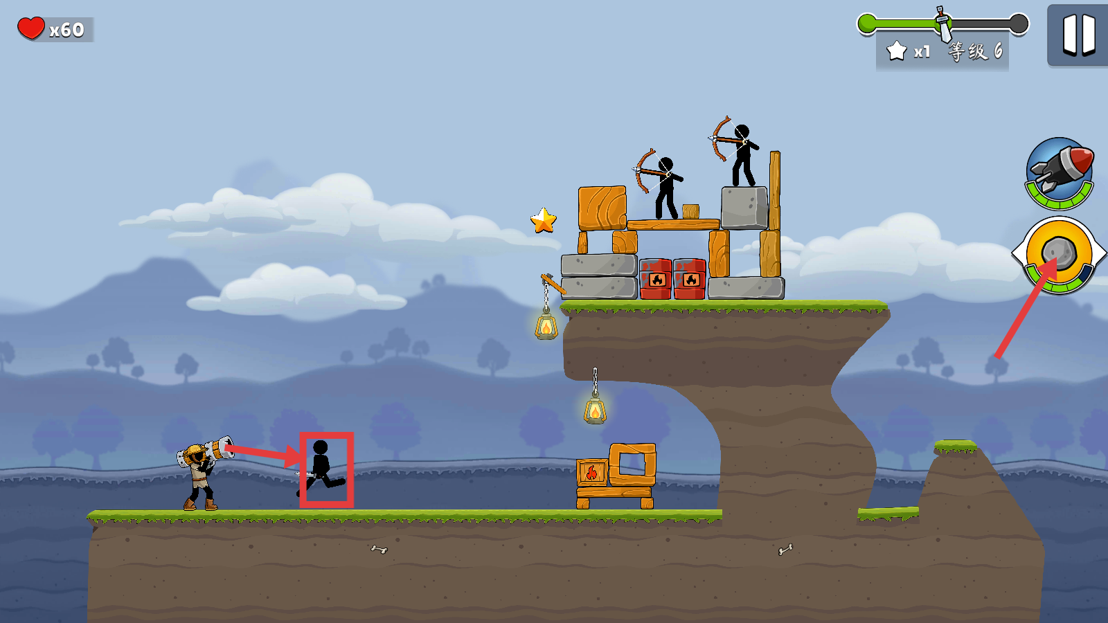 2、进入关卡后,关注【心x60】生命值,利用武器攻击敌方小兵和建筑,推进战斗进程。
