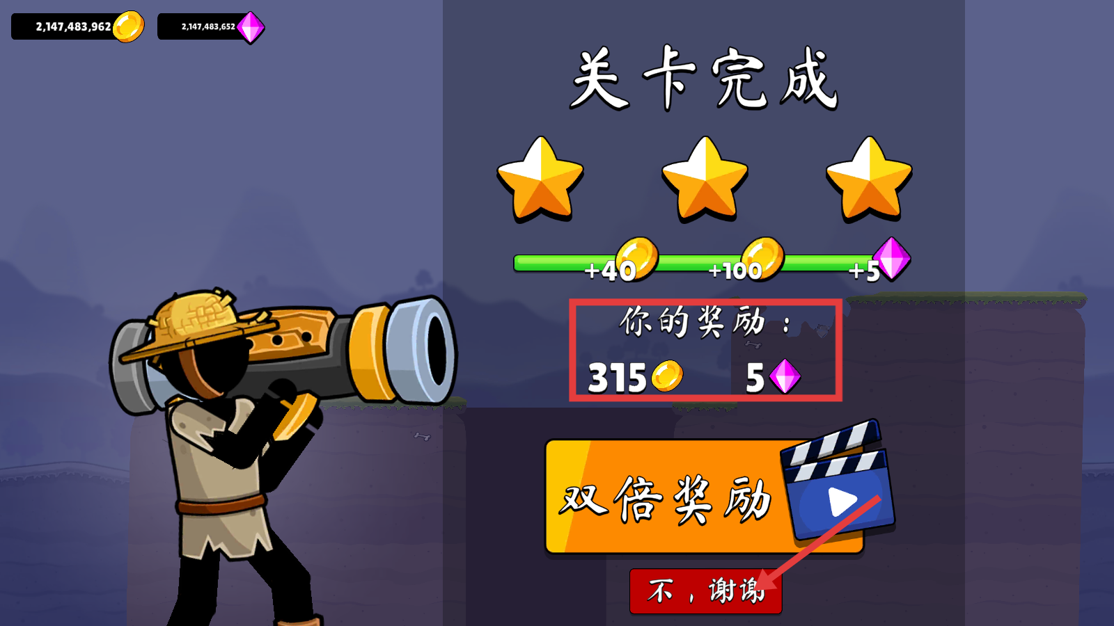 4、关卡完成后领取【315-金币】和【5-钻石】奖励,可选择“双倍奖励”或点击“不,谢谢”继续游戏。