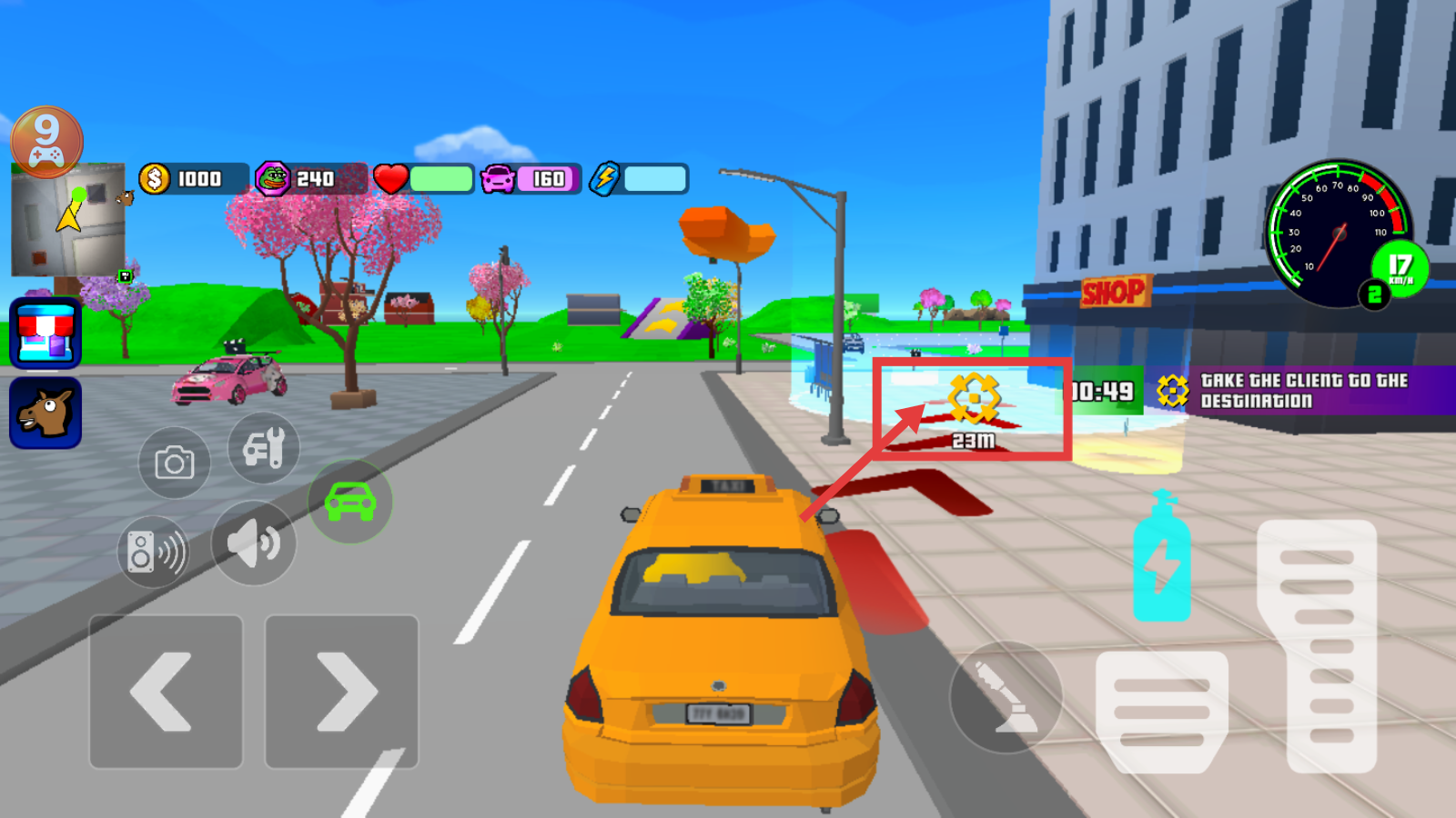 1、驾驶时用左右方向键操控车辆,点击加速按钮提升速度,完成【TAKETHECLIENTGOTHEDESTINATION】任务,留意界面资源数值。