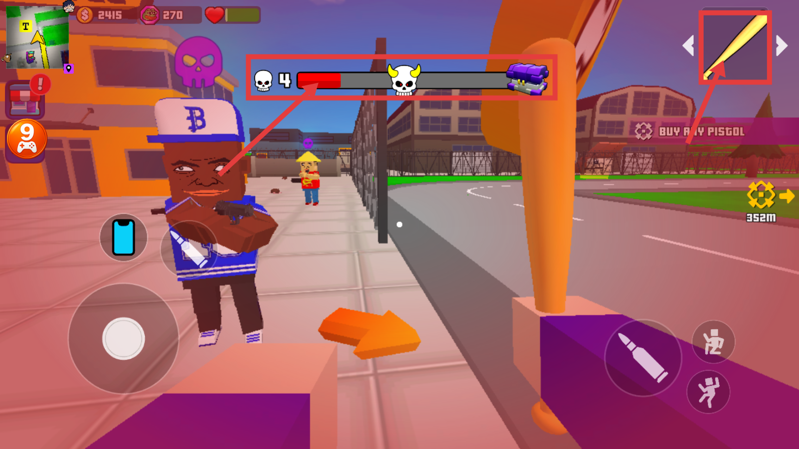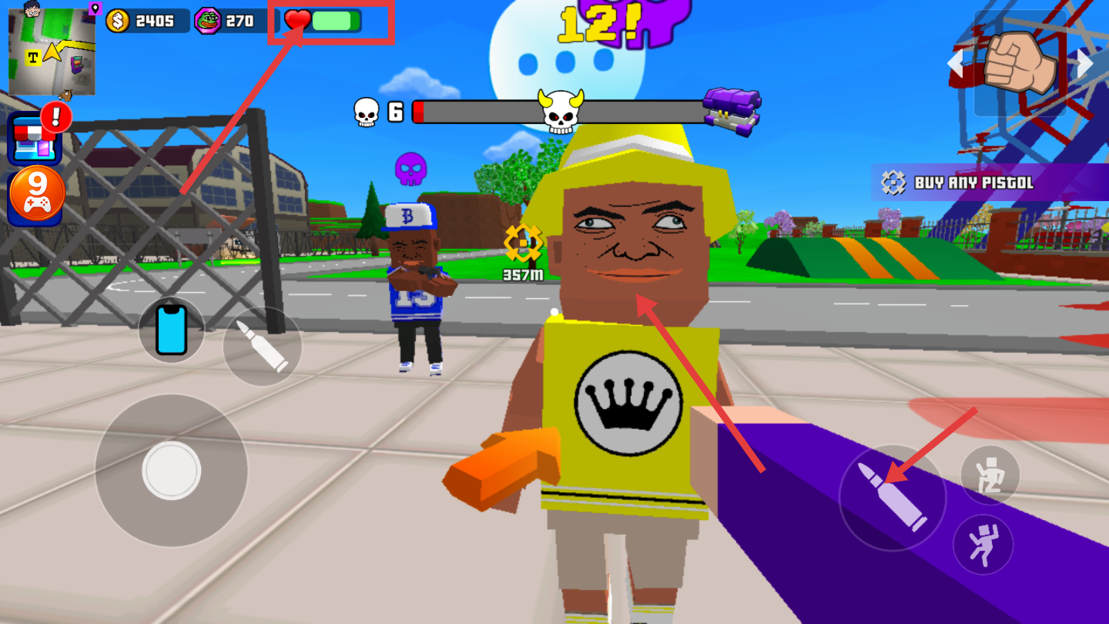 2、战斗时关注血量条,利用攻击按钮发起进攻,保持战力,推进【BUYANYPISTOL】任务进度。