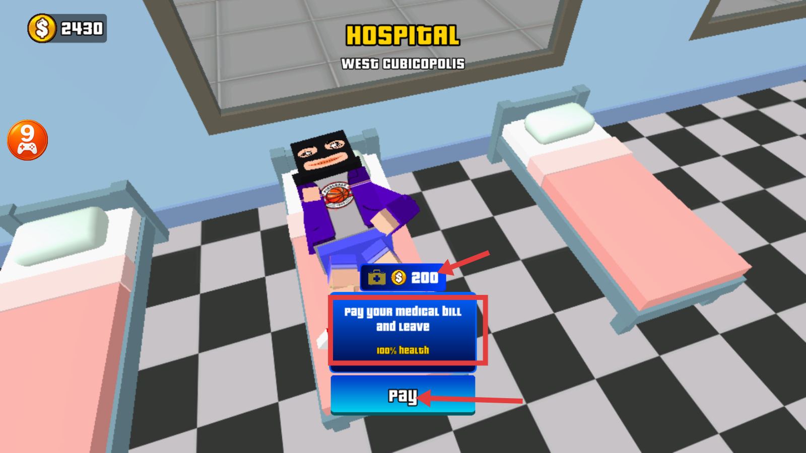 4、若血量不足,前往【HOSPITAL-WestCubicopolis】,支付【$200】医疗账单,点击【Pay】恢复100%健康,继续游戏。
