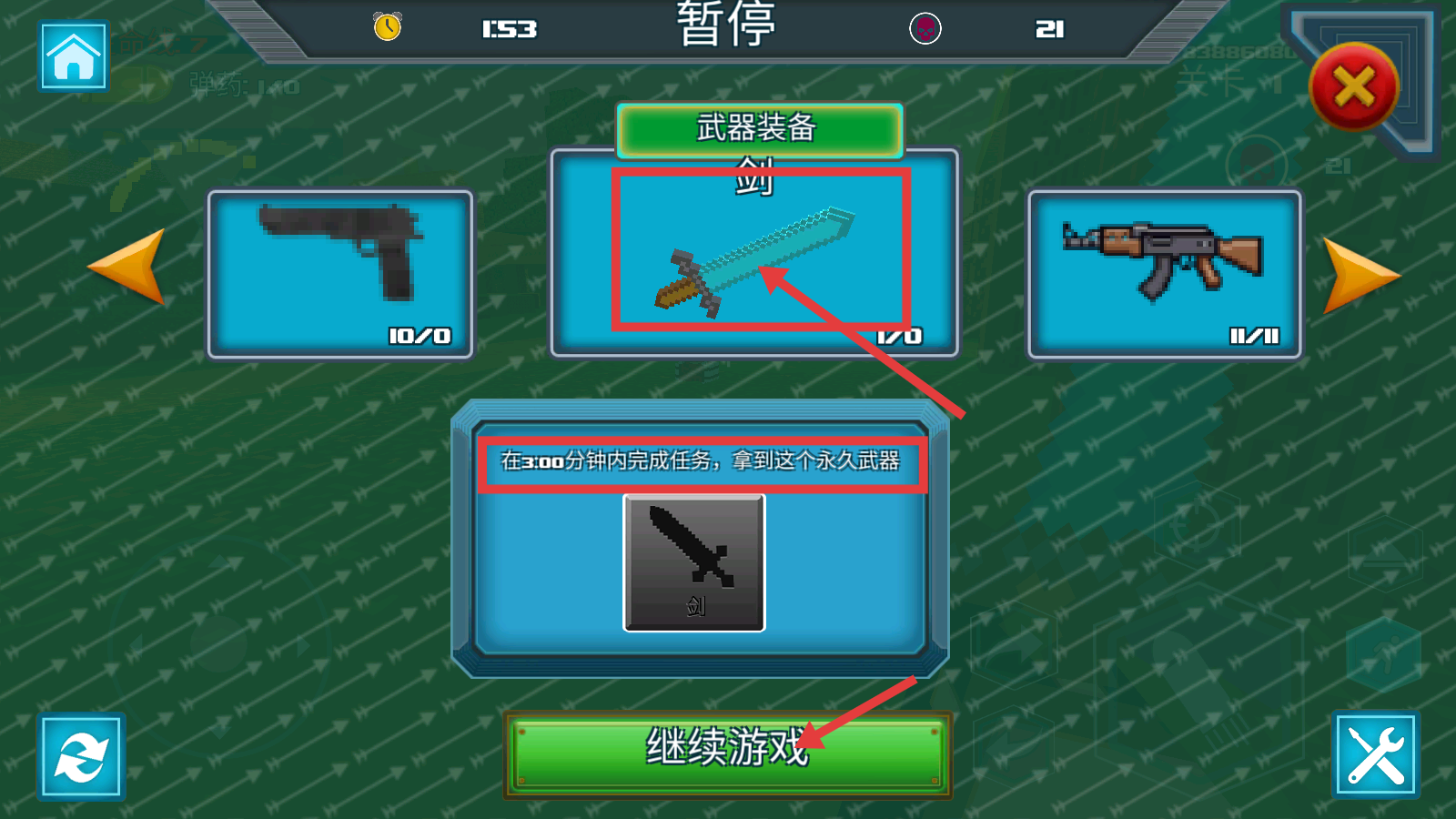 3、在暂停界面查看【武器装备-剑】,需在300分钟内完成任务,获取永久武器,点击【继续游戏】推进进程。