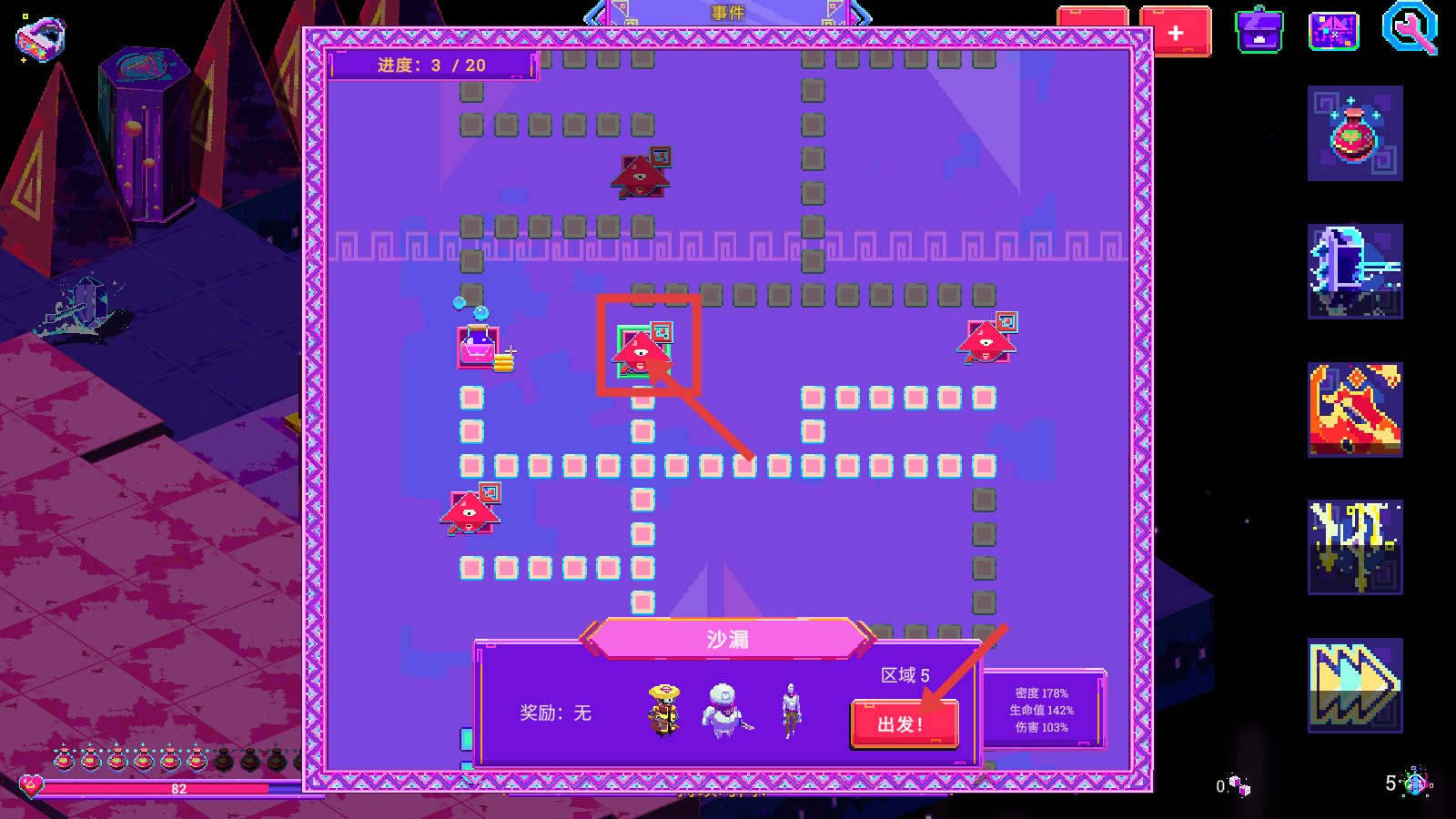1、关注【进度-3/20】,点击【沙漏-区域5】的【出发!】,进入区域探索,应对红色三角敌人。