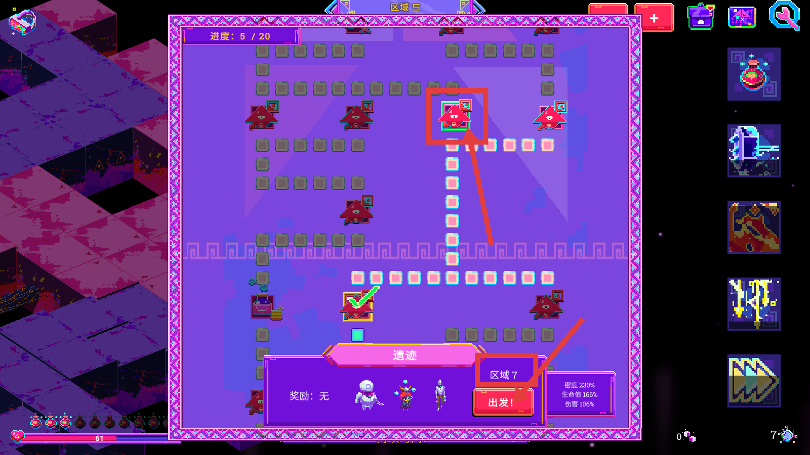 4、完成区域5后,点击【遗迹-区域7】的【出发!】,进入新区域挑战,继续推进进度。