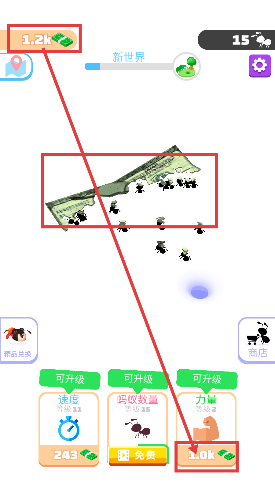 1、积累到1.2k资金后,优先升级【力量-1.0k】,让蚂蚁能高效搬运大额资源,快速积累更多资金。