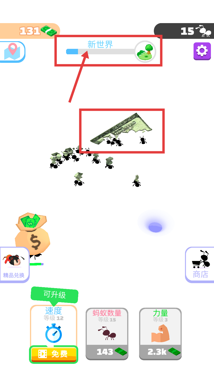 2、关注【新世界】进度条,通过蚂蚁持续搬运资源,推进进度以解锁新区域和内容。