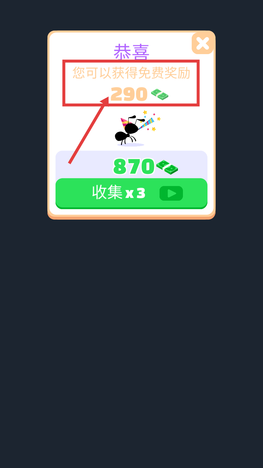 3、领取【免费奖励-290】资金,可通过点击【收集x3】观看广告,获取三倍资金用于各项升级。
