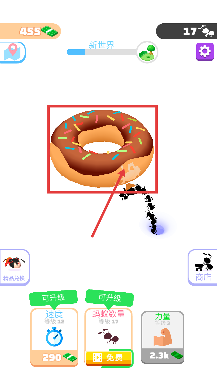 4、蚂蚁搬运甜甜圈时,升级【速度】和【蚂蚁数量】,提升新食物资源的搬运效率,快速积累资金。