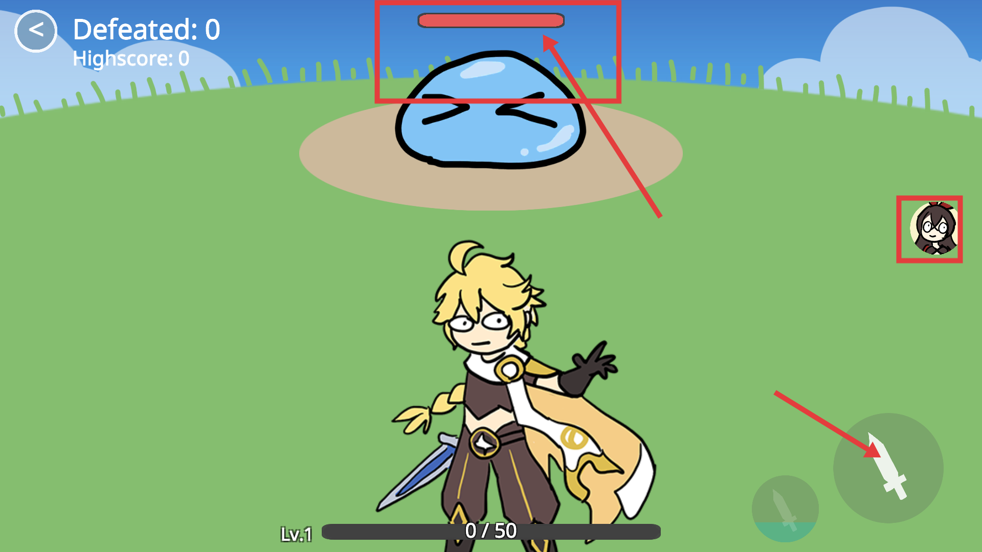 2、战斗时关注史莱姆血条,点击攻击按钮,可切换【火兔】角色,利用其技能攻击史莱姆。