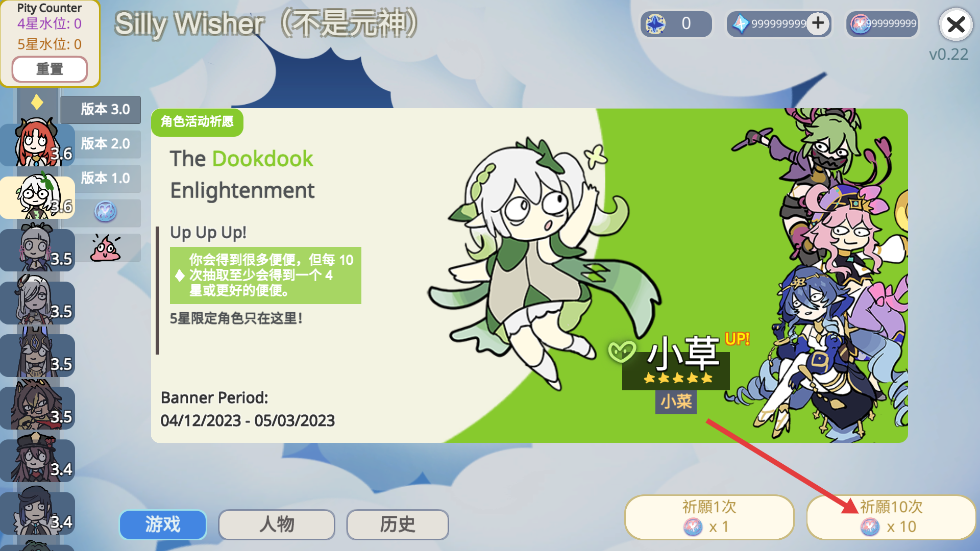 1、参与【The-Dookdook-Enlightenment】角色活动祈愿,优先选择【祈願10次】,利用保底机制获取角色。