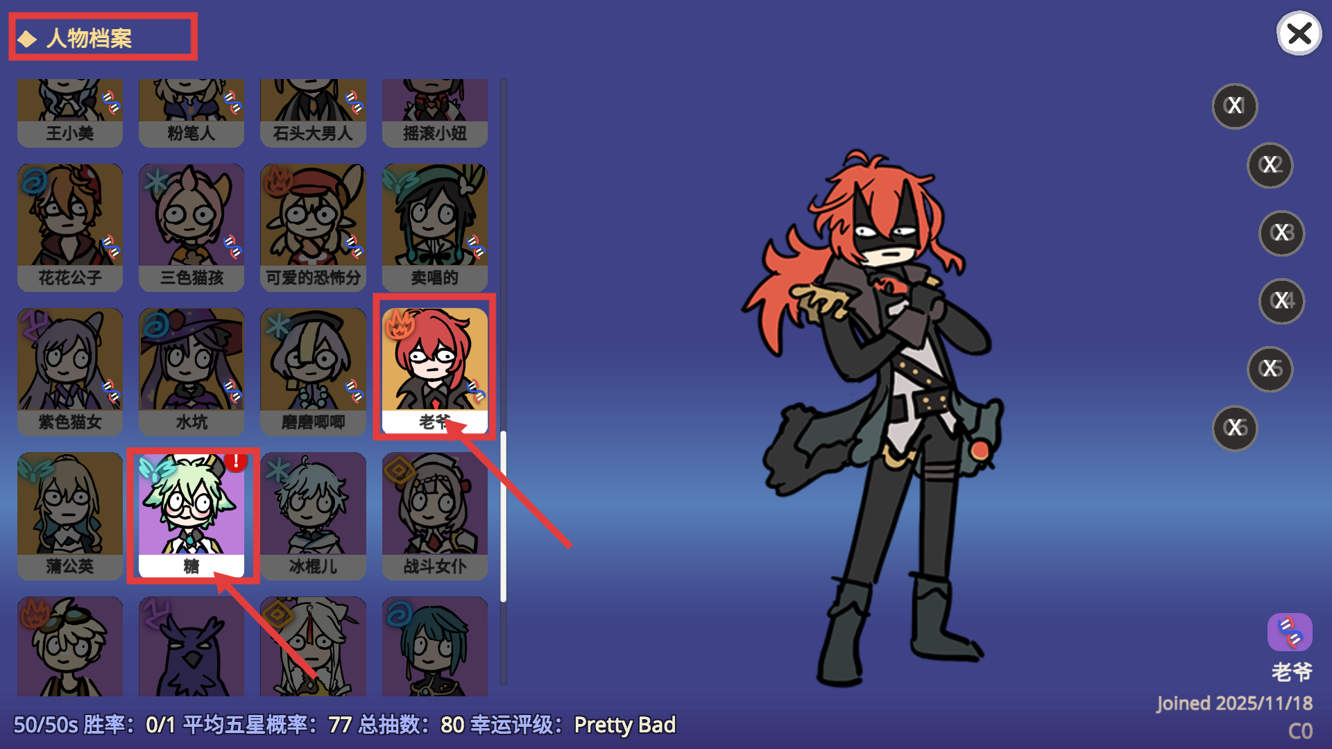 2、进入【人物档案】,查看【老爷】【糖】等角色的详细信息,了解其属性和技能,规划角色培养。