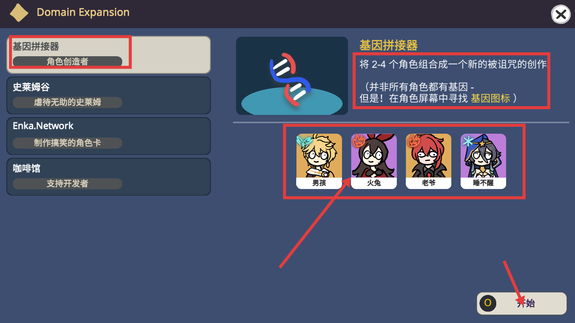 3、选择【基因拼接器-角色创造者】,选取【男孩】【火兔】【老爷】【睡不醒】,点击【开始】进行基因拼接。