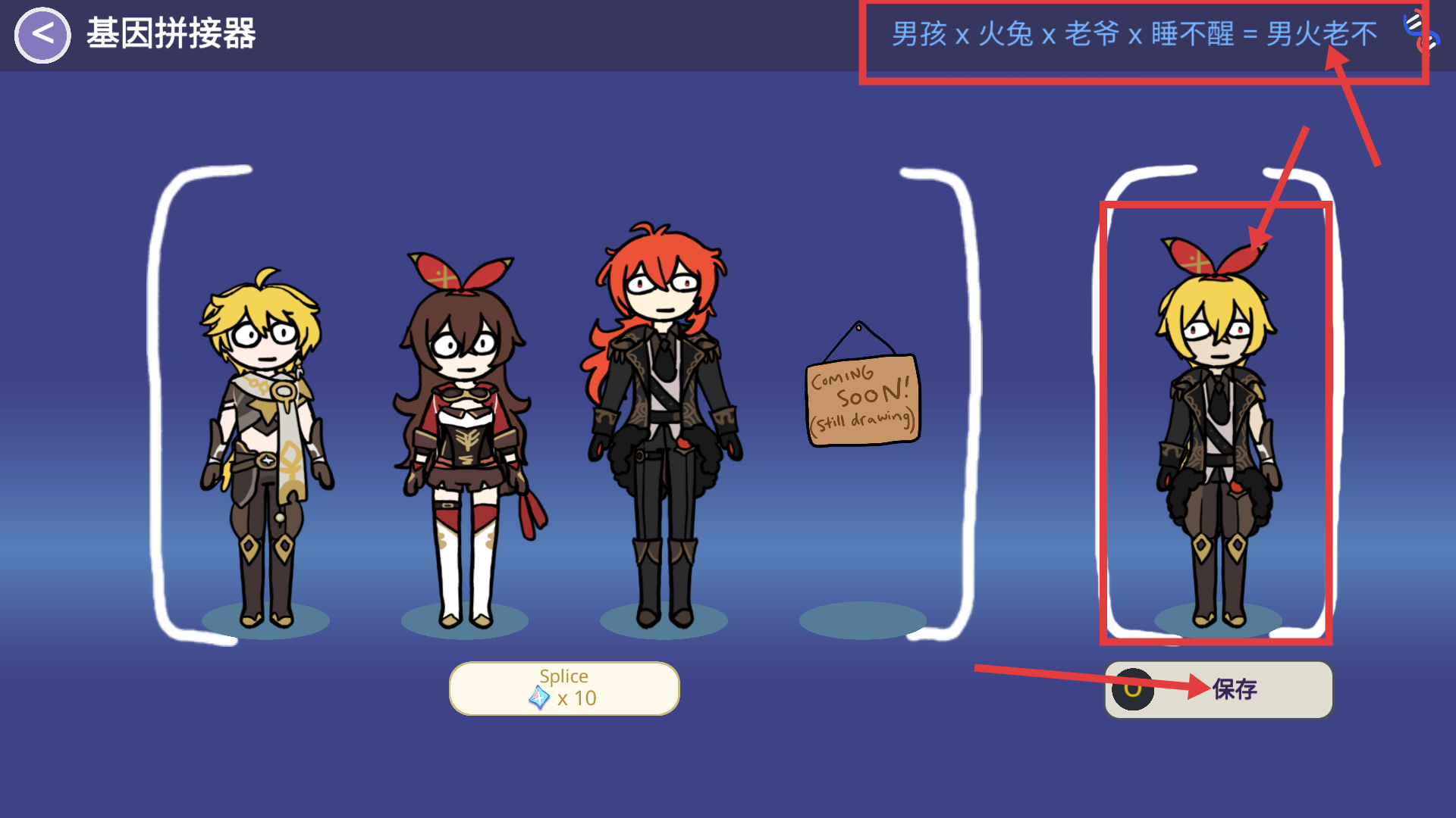 4、基因拼接后生成【男火老不】新角色,点击【保存】,将其加入角色库,可用于后续游戏或拼接。