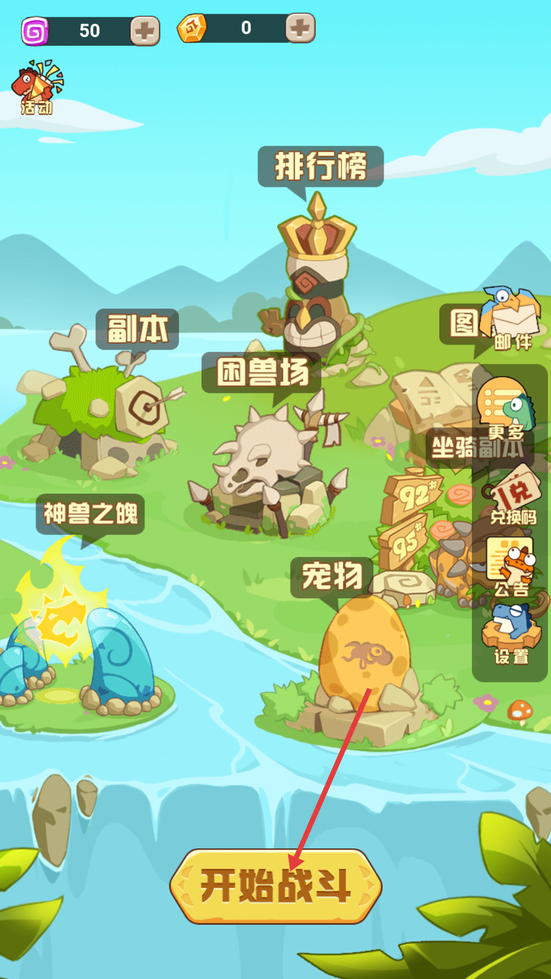1、点击【开始战斗】,进入游戏界面,可参与副本、困兽场等玩法,开启史前战斗之旅。
