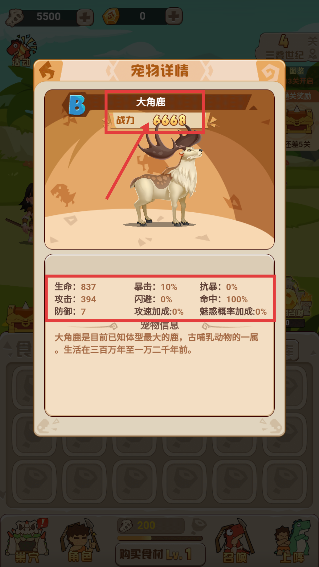 3、查看【大角鹿-战力6668】的宠物详情,了解其生命-837、攻击-394等属性,为宠物培养做规划。