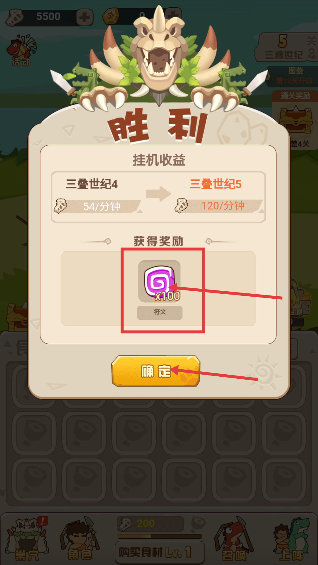 4、战斗胜利后,获得【符文-x100】奖励,点击【确定】领取,提升挂机收益,解锁三叠世纪5关卡。