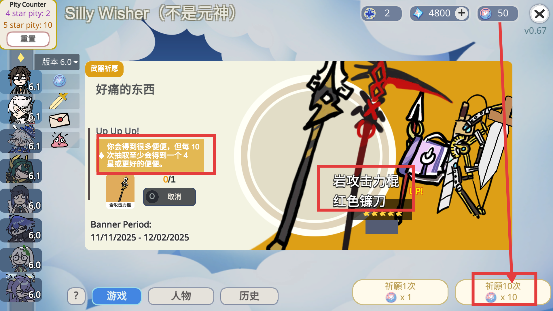 1、参与【武器祈愿-好痛的东西】,优先选择【祈願10次】,利用保底机制,获取【岩攻击力棍】【红色镰刀】等武器。