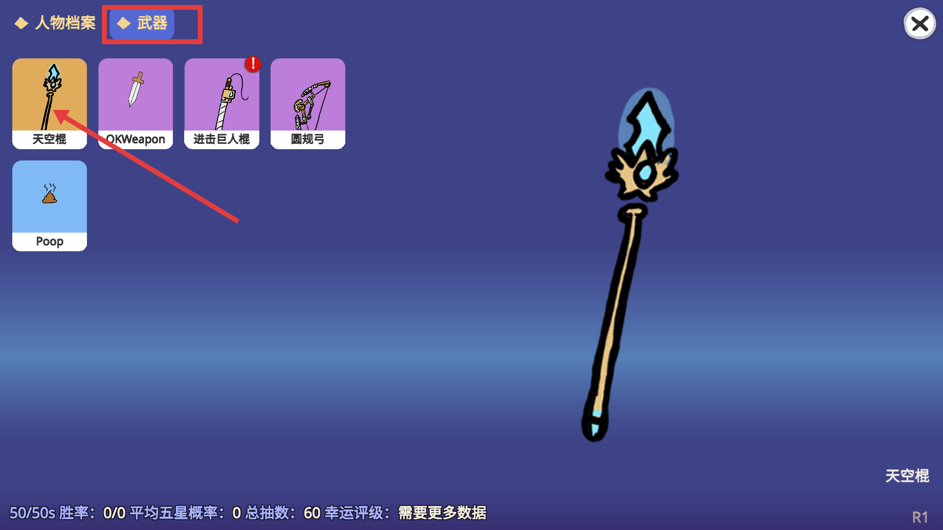 3、进入【武器】界面,查看【天空棍】详情,了解其属性,为角色搭配该武器,提升战斗能力。
