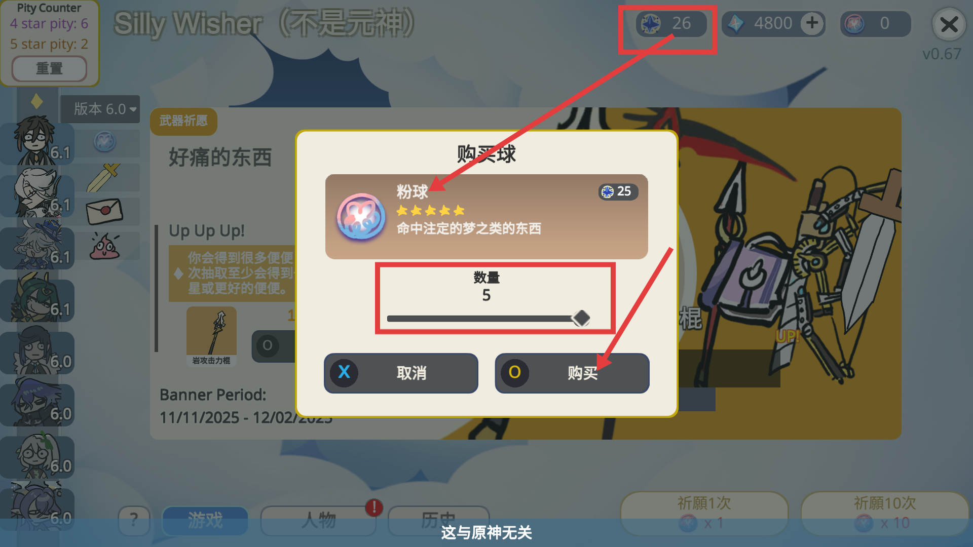 4、消耗【26-资源】购买【粉球-5个】,积累祈愿道具,为后续武器祈愿储备资源。