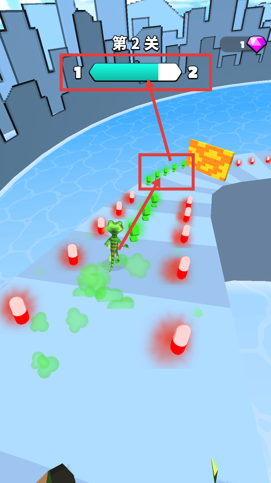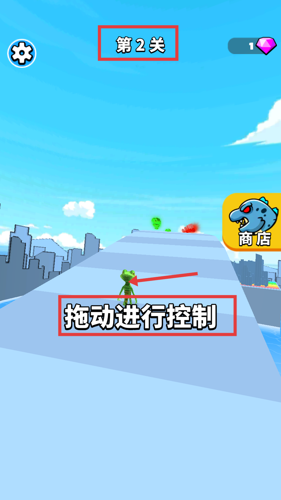 1、第2关时,通过【拖动进行控制】绿色角色移动,开启跑酷挑战,熟悉操作方式。