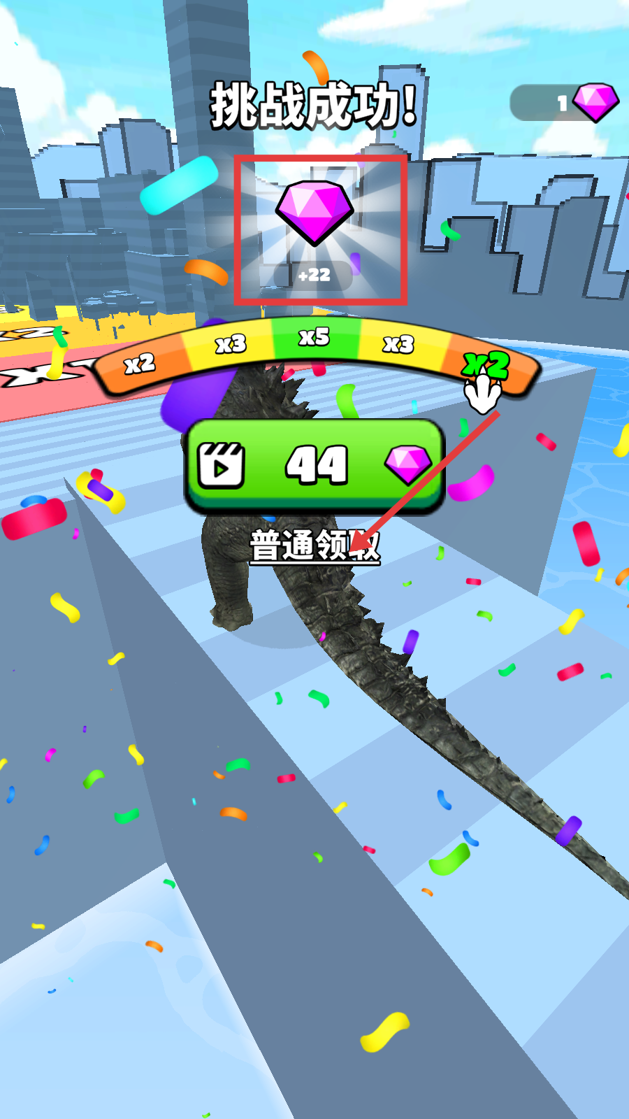 4、挑战成功后,获得【紫色钻石+22】奖励,点击【普通领取】,积累资源开启下一关。