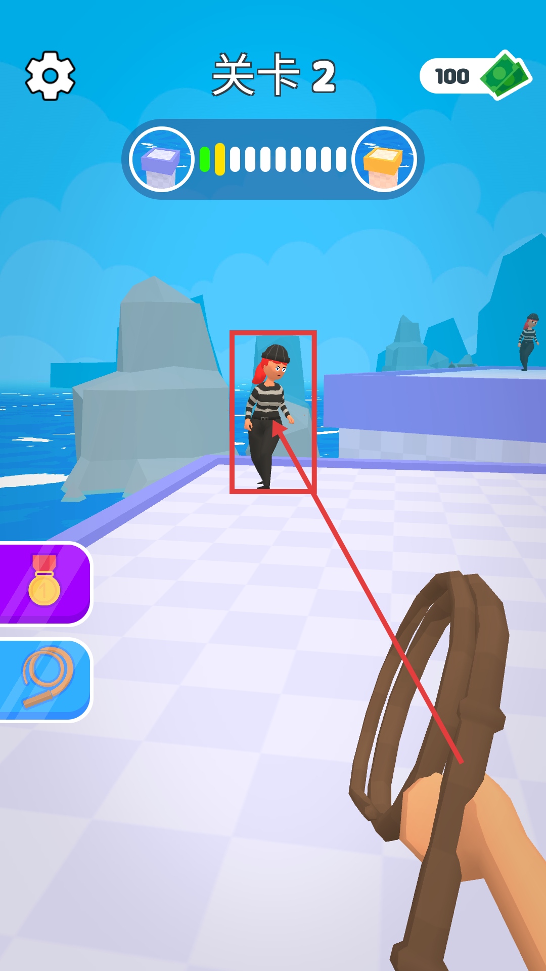 1、关卡2中,遇到穿着囚服的敌人,利用手中绳索类道具瞄准敌人,为将其丢出场外做准备。