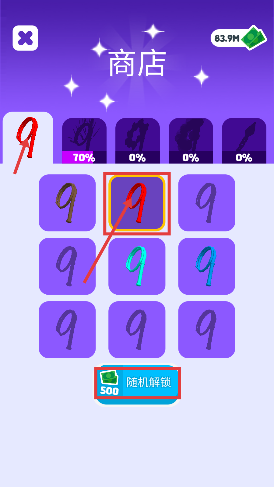 1、在【商店】界面可消耗资源点击【随机解锁】,获取不同样式的鞭子道具,提升道具多样性以应对不同关卡场景。