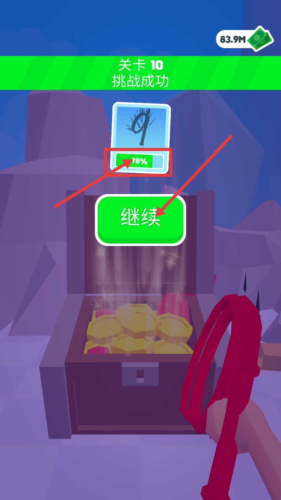 4、【关卡10】挑战成功后,查看鞭子解锁进度【78%】,点击【继续】按钮进入下一段挑战,逐步积累进度解锁更多道具。