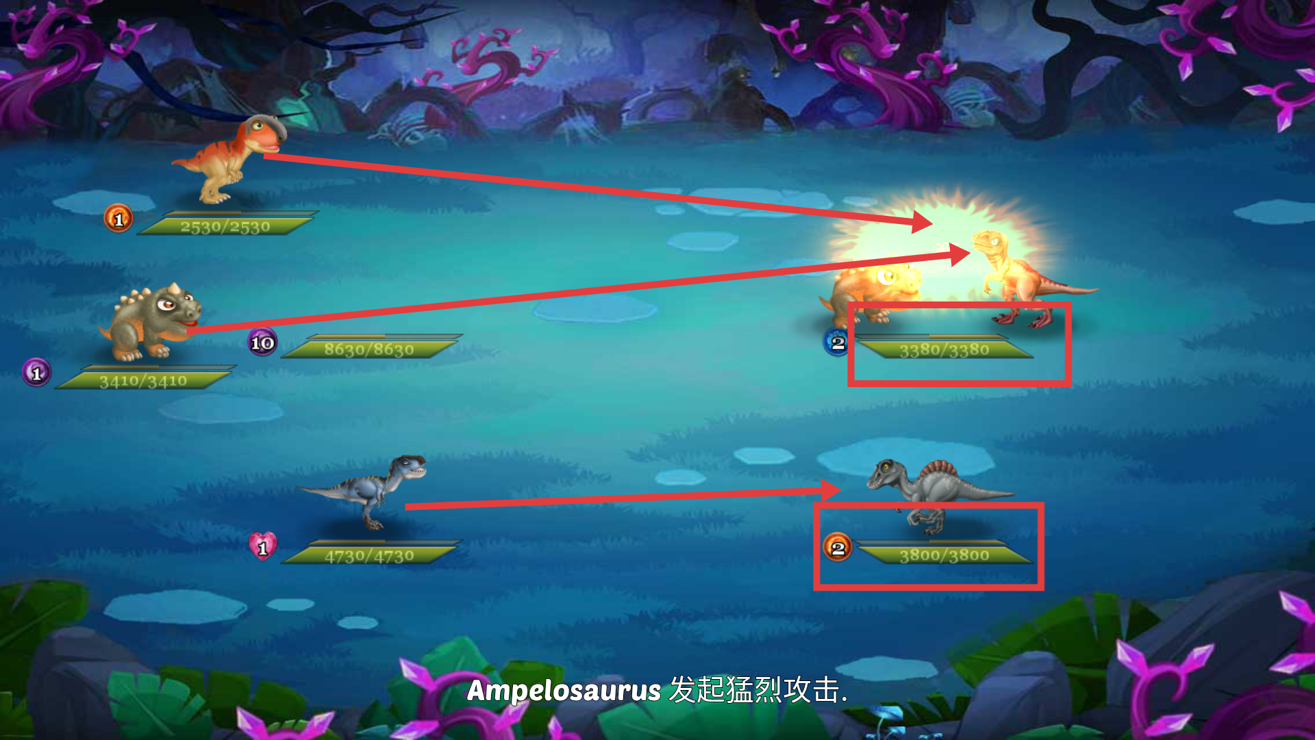3、战斗中利用己方恐龙(如Ampelosaurus)发起攻击,优先瞄准敌方【3380/3380】【3800/3800】血量的恐龙,高效制胜。