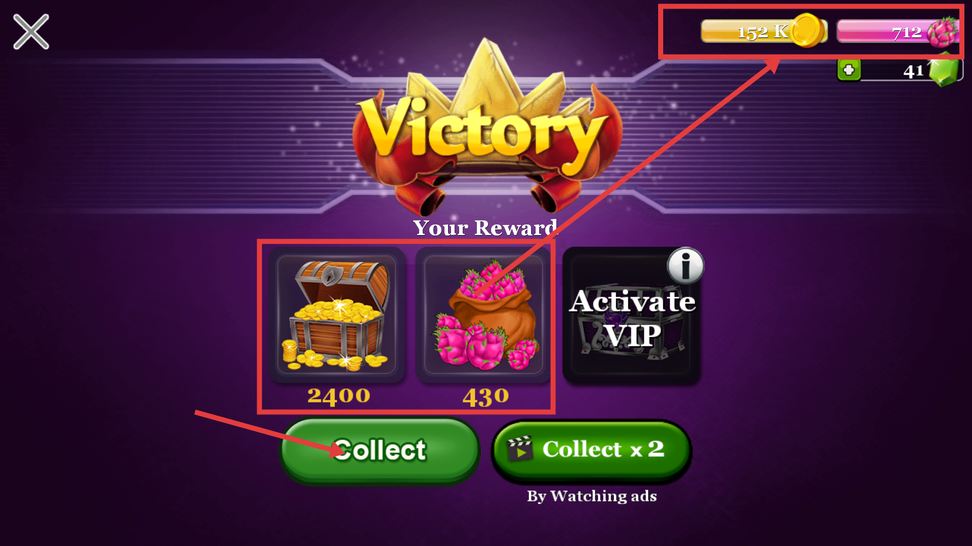 4、战斗胜利后,点击【Collect】按钮领取【金币-2400】【火龙果-430】等奖励,积累资源用于提升恐龙战力。