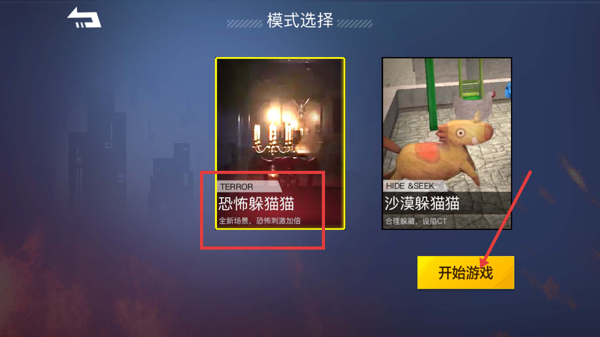 1、选择【恐怖躲猫猫-TERROR】模式,点击【开始游戏】,体验全新恐怖场景的躲猫猫玩法。