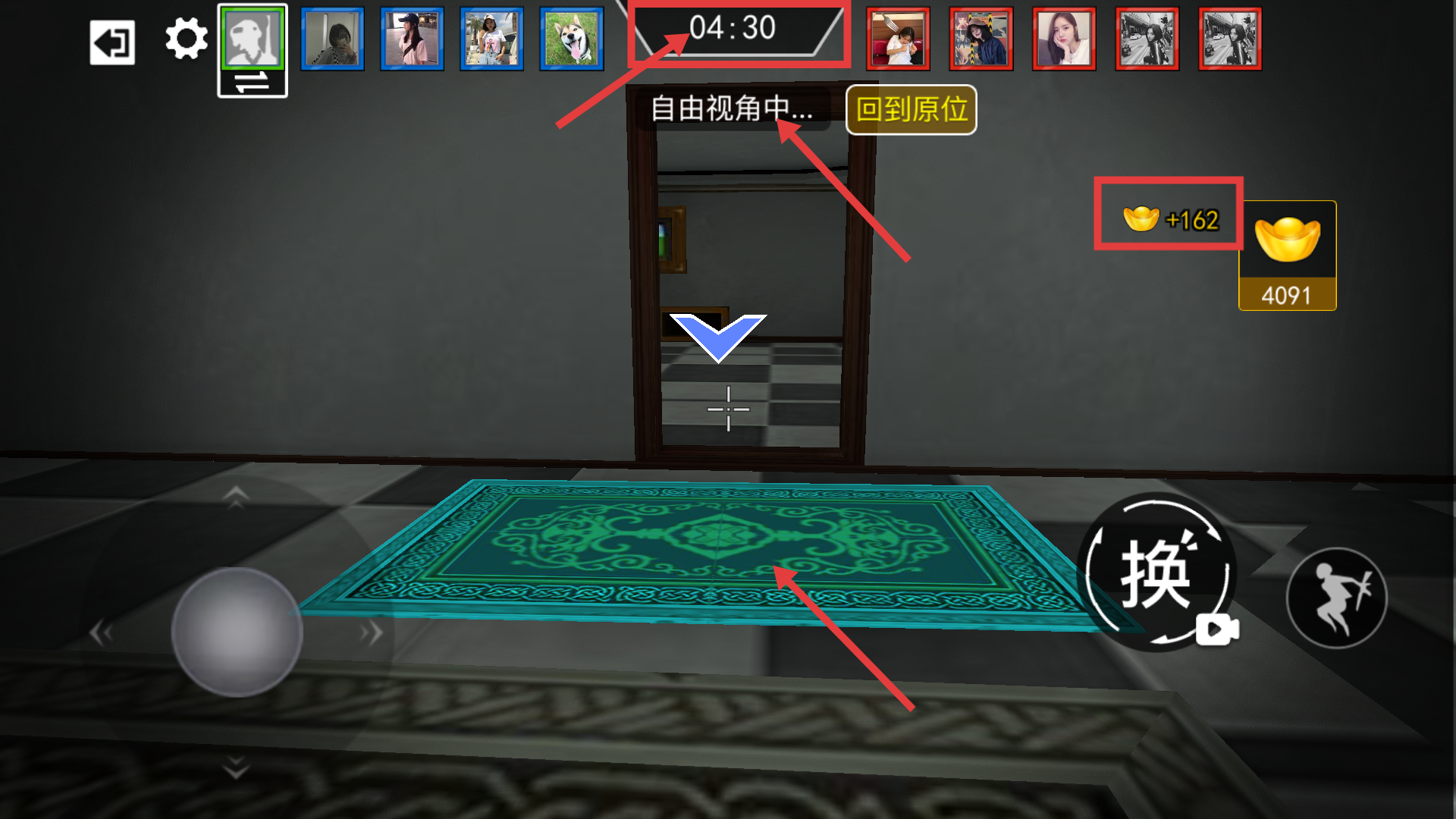 3、躲藏时可开启【自由视角中...】观察局势,同时积累【+162-元宝】奖励,提升资源储备。