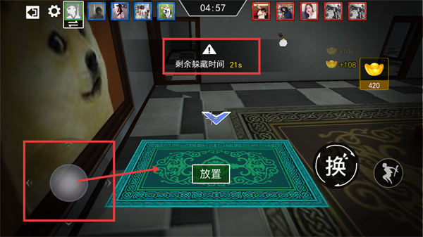 2、在躲藏阶段,关注【剩余躲藏时间-21s】,利用左侧控制移动,点击【放置】快速隐藏,避免被发现。