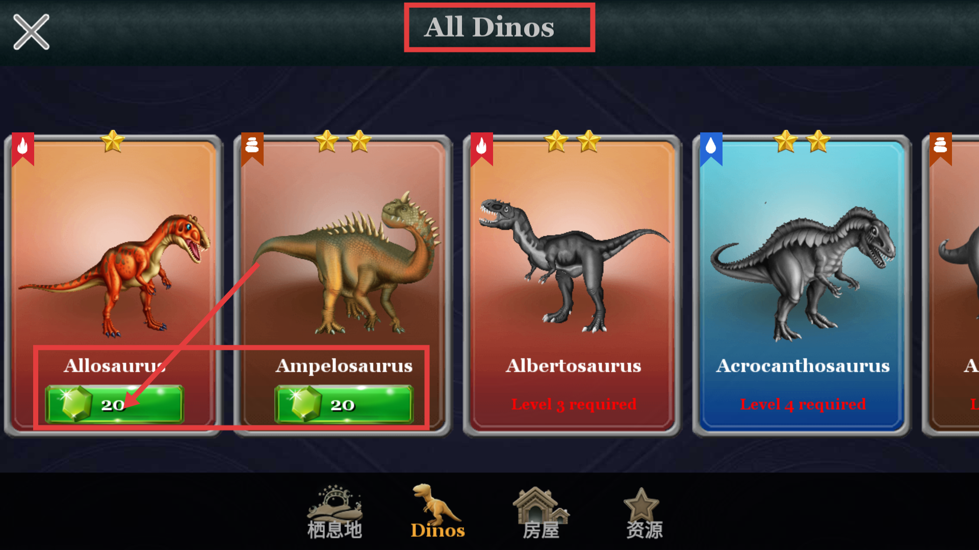 1、在【AllDinos】界面,消耗【20-绿宝石】解锁【Allosaurus】【Ampelosaurus】等恐龙,扩充恐龙阵容提升战力。