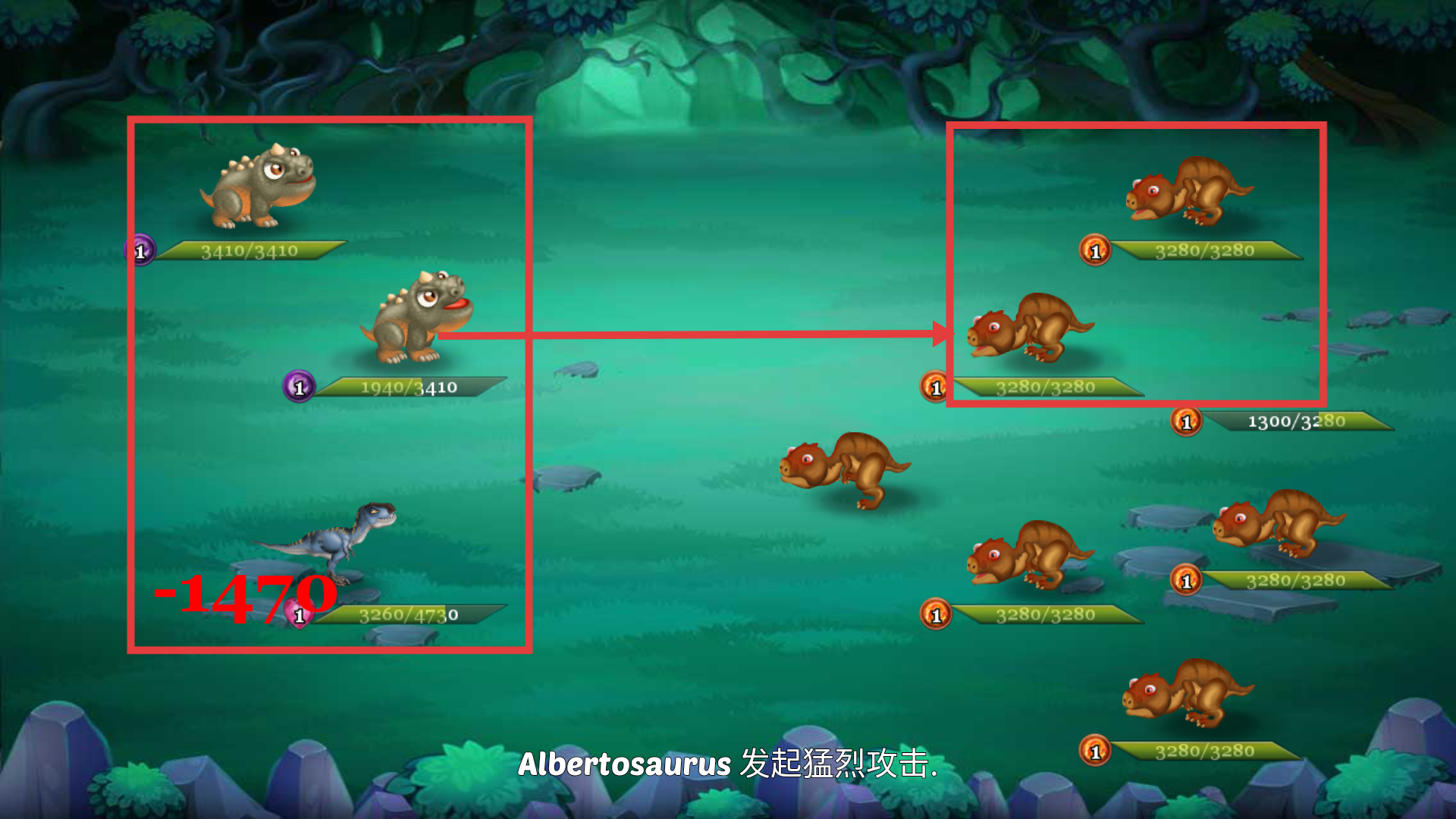 3、战斗中操控己方恐龙(如Albertosaurus)发起攻击,关注敌方恐龙血量,策略性进攻提升胜率。