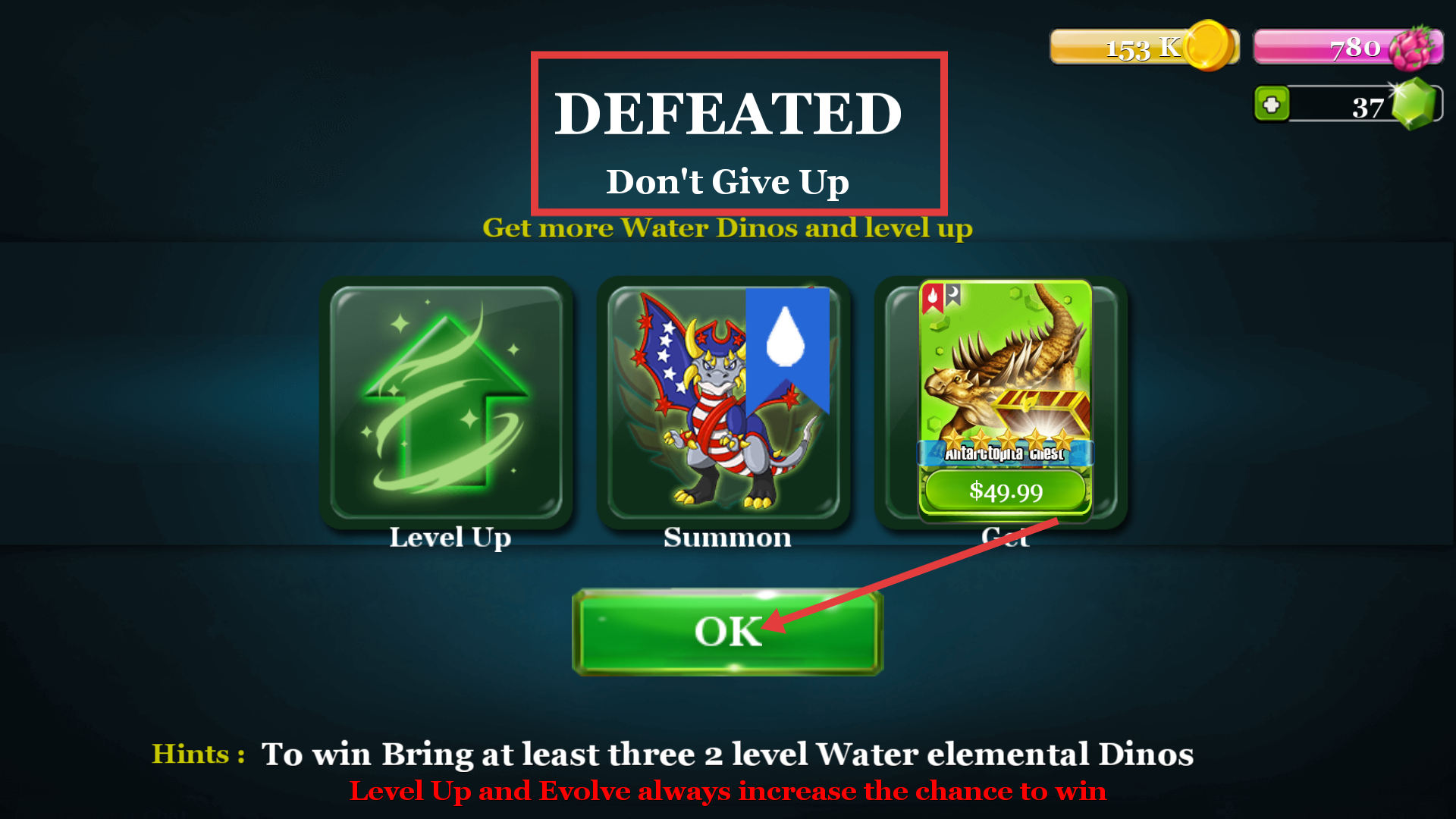 4、若战斗显示【DEFEATED-Don'tGiveUp】,点击【OK】继续,需培养至少三只2级水元素恐龙,通过升级进化提高获胜概率。