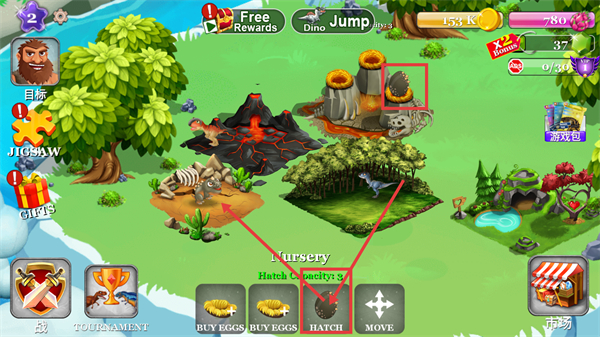 2、在恐龙乐园点击【HATCH】孵化恐龙蛋,增加恐龙数量,同时完成【目标】【礼物】等任务积累资源。