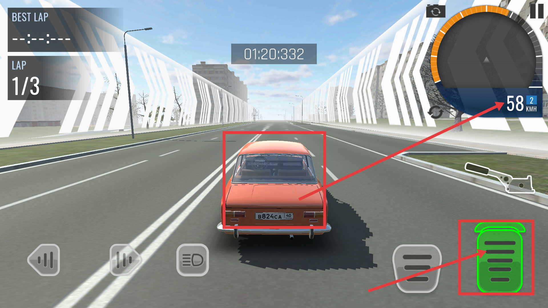 2、驾驶时通过右侧油门键控制车速,如保持【58-KMH】稳定行驶,左侧方向键调整方向,注意【1/3】圈数进度。