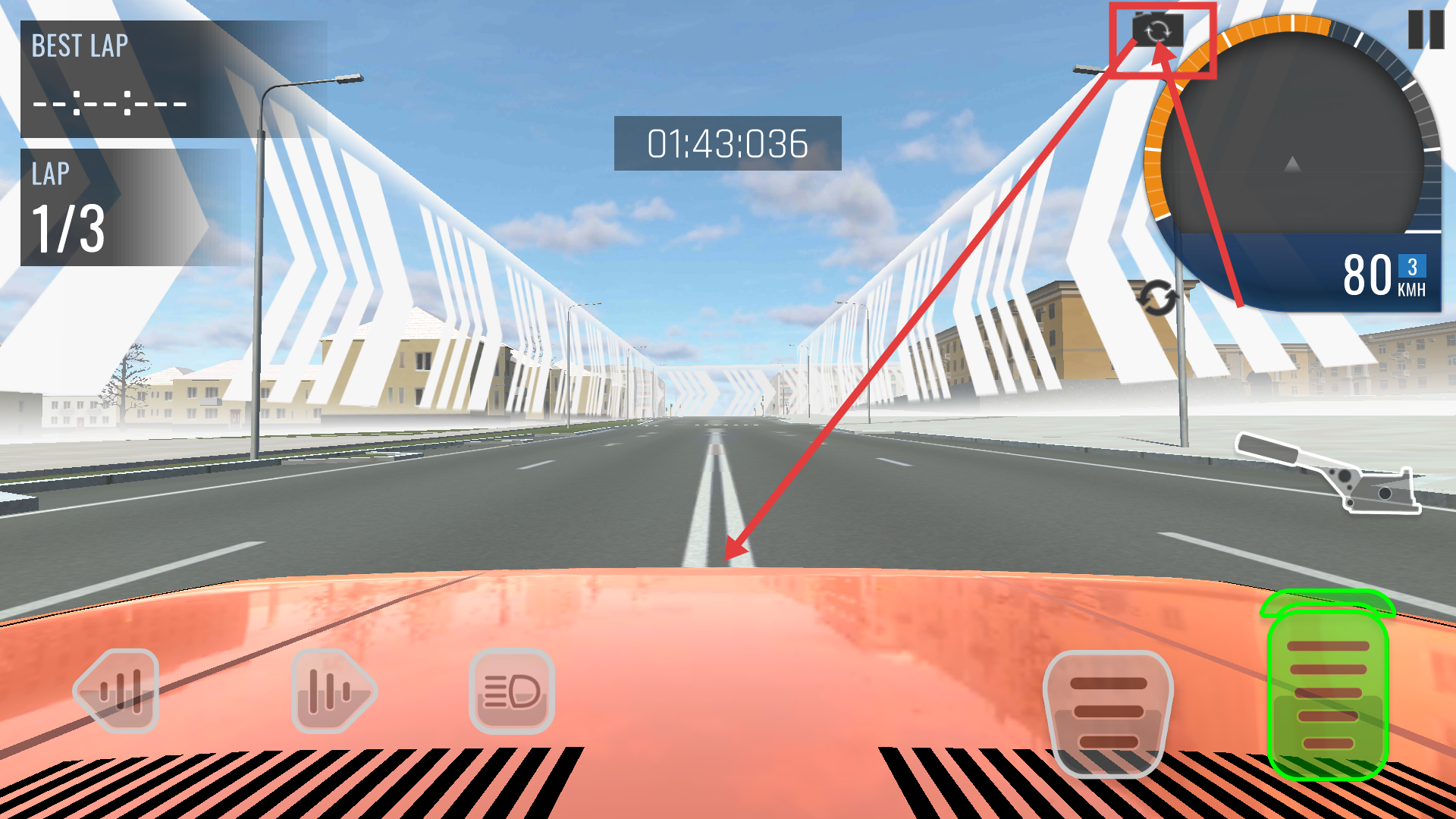 3、比赛中可点击视角切换按钮调整视角,保持如【80-KMH】的车速,优化驾驶视野以提升成绩。