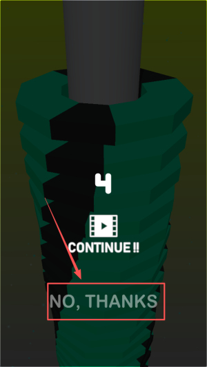 4、失败后选「CONTINUE!!」看广告复活,或点「NO, THANKS」重开新局。