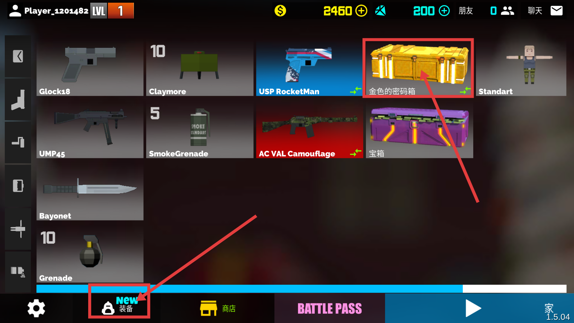 1、进入【装备】界面,找到【金色的密码箱】,可开启获取稀有道具的流程,优先关注该宝箱的奖励内容。