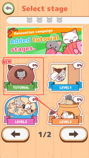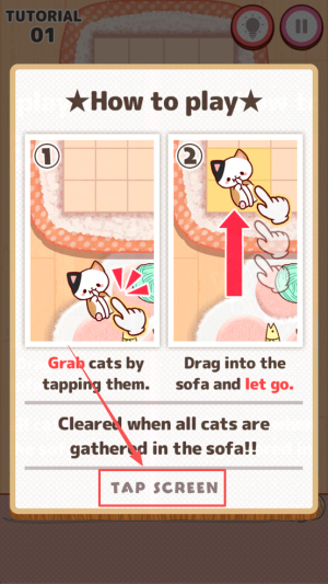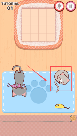2、选「TUTORIAL」或「LEVEL1」,看清示范:点击猫咪抓住它。