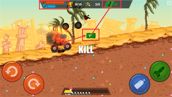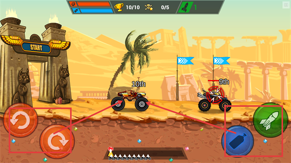 2、熟悉左侧转向按钮和右侧【火箭】【加速瓶】道具操作,操控车辆在赛道中提升排名,应对对手挑战。